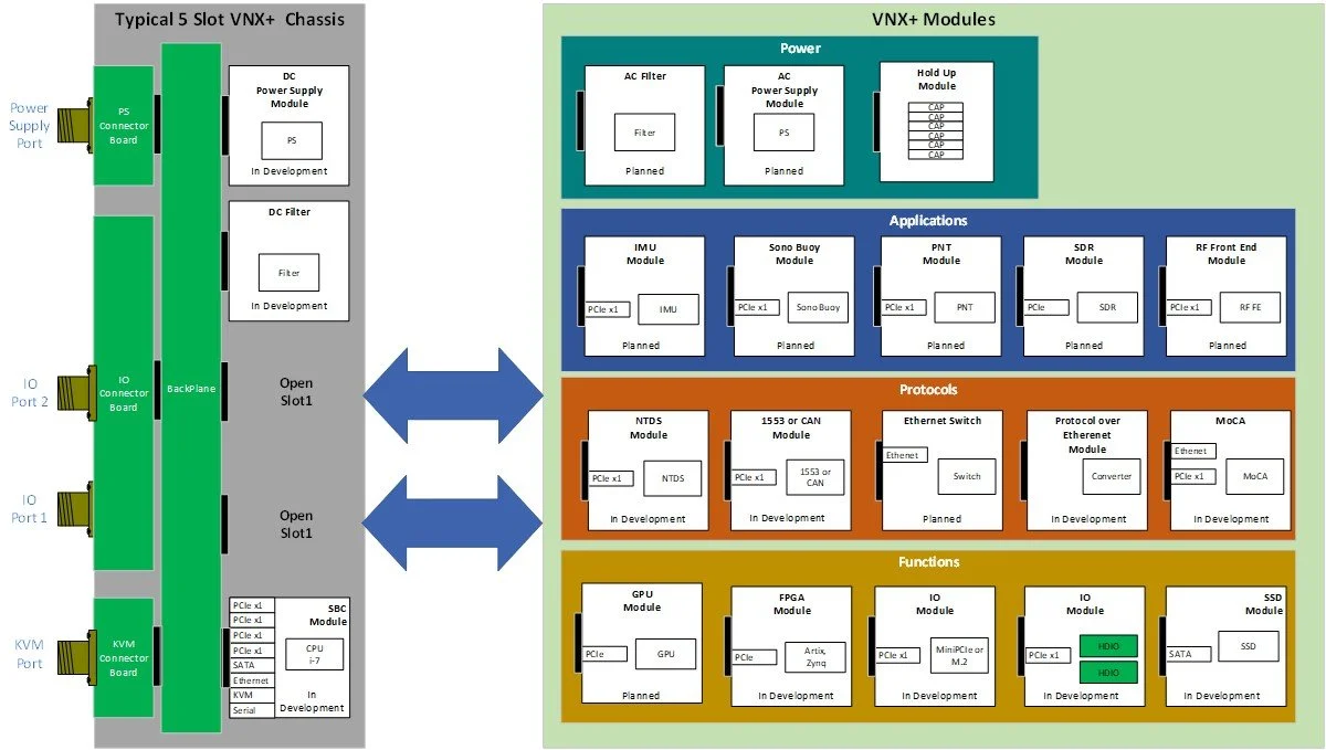 VNX+ systems are designed for operation in harsh and space-constrained environments including unmanned vehicles, ground vehicles, shipboard platforms, and other rugged deployments, where size, weight, power, and cost (SWaP-C) are critical constraints. The architecture supports scalable compute, I/O, networking, and acceleration modules while maintaining ruggedization, interoperability, and lifecycle longevity.